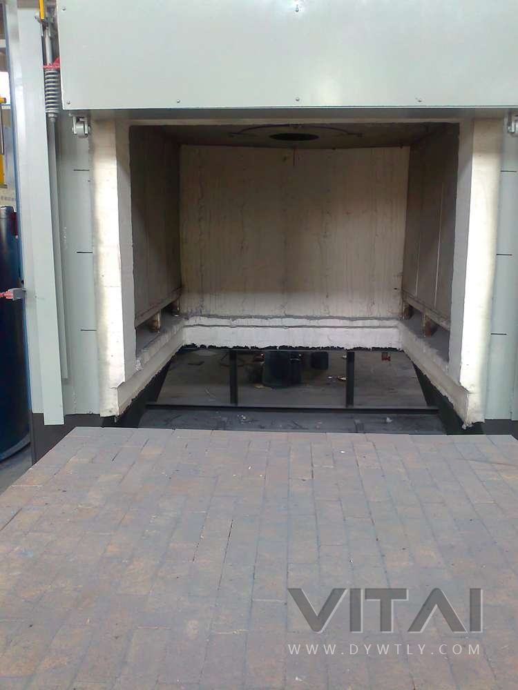 炉衬制作采用目前结构---全纤维炉衬。炉体侧墙、顶部、炉门和后墙全部为纤维,炉体下部周围与台车结合处采用重质高铝耐火砖砌筑,可有效防止撞击。纤维在安装前预制成模块,并事先在模块内部安置耐热钢锚固件。安装时先在炉壁上有规律地焊装耐热钢螺栓,砌筑时只要将预制纤维模块用螺帽锁紧便成。预制模块的压缩量高达30%,且在砌筑时采用交错砌筑法,在安装完毕后散包时借模块的膨胀力,整个炉衬形成一个致密的整体,没有直通缝隙,炉衬绝热性能可提高20%。加热元件可布置在炉膛四周。炉顶部砌体也为全纤维结构,纤维模块砌筑方法与四周一样。由于模块为机械化流水线生产,所有纤维模块尺寸一致,那么在安装完毕后稍加整形,外形平整美观。